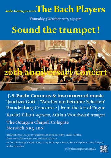 To mark our twentieth anniversary, we return to our beginnings to present an all-Bach programme: two joyous, well-known cantatas, complemented by two celebrated instrumental works. ‘Weichet nur betrübte Schatten’ is a wedding canata for solo soprano voice; ‘Jauchzet Gott’ gives virtuosic parts to solo soprano and trumpet. The trumpet is featured also in Brandenburg Concerto no. 2. We will also play selections from the Art of Fugue. This will be a special, celebratory event.