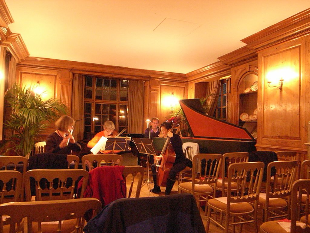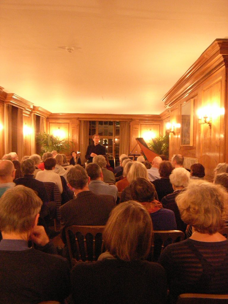 We played our ‘Musical offering’ programme last week in the Music Room at Burgh House, Hampstead, in London. This was a real chamber music experience: every seat in the wood-panelled room was occupied, and the atmosphere was intimate and intense: the music took over. Photos here show the group rehearsing, Silas Wollston explaining his arrangement of the canons in Bach’s work, and the final applause.