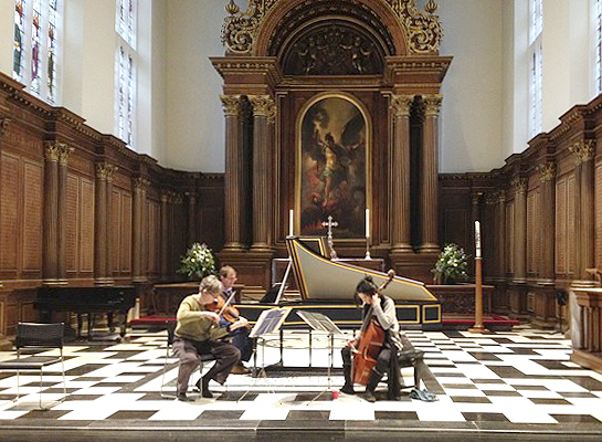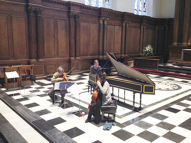 Last Friday we played our ‘Musical offering’ programme for Cambridge Early Music at Trinity College Chapel, to a warm and enthusiastic audience. In the afternoon, Marion Moonen made these photos of Nicolette Moonen, Silas Wollston, and Reiko Ichise rehearsing the Buxtehude sonata.