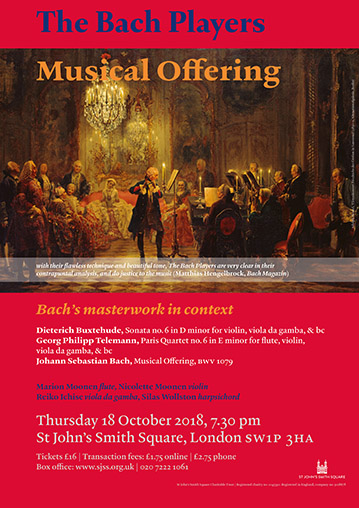 Johann Sebastian Bach’s Musical Offering (BWV 1079) is a late work that both looks back to the tradition in which he was grounded and forward to the music of his sons. The concert opens with a sonata by Buxtehude, Bach’s admired elder: we hear the ‘stylus phantasticus’ in full flight, with its unpredictable structures and sometimes startling improvisatory freedoms. The fashionable flute features in the Paris quartets by Telemann, Bach’s close contemporary. No. 6 in E minor is in the French galant style – a succession of character pieces, culminating in a wonderful chaconne. The Musical Offering is often taken to be a disjointed collection of fragments, dominated by the culminating, beautiful trio sonata. This performance treats the work as an essay in the musical rhetoric in which Bach was immersed. The succession of canons and fugues become a speech – a musical oration, in which factual statements are then elaborated on and developed in argumentative sections, interspersed with charming passages that may seduce the listener. The sonata then gives free rein to the whole spectrum of emotions. The work concludes with a final, calming ‘perpetual canon’. This is a chance to hear Bach’s famous piece with fresh ears.