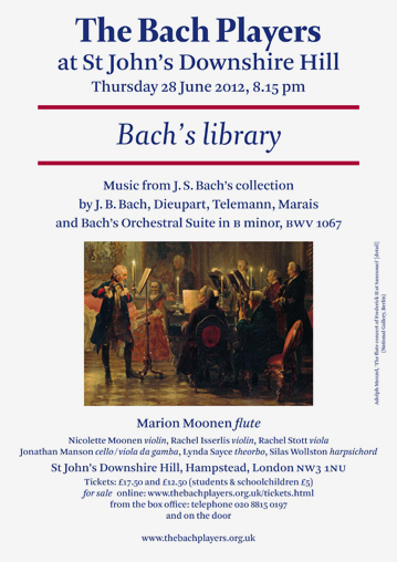 (Marion Moonen flute, Nicolette Moonen violin, Rachel Isserlis violin, Rachel Stott viola, Jonathan Manson cello / viola da gamba, Lynda Sayce theorbo, Silas Wollston harpsichord)
