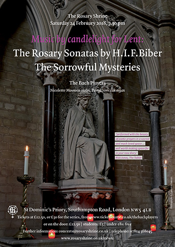 The second of three concerts in which Nicolette Moonen (violin) and Pawel Siwczak (organ) perform all of the Rosary Sonatas by H.I.F. Biber (1644–1704) – by candle light, in the appropriate side-chapels at St Dominic’s, and in the appropriate liturgical season. In this concert they play the second cycle of five sonatas, concerned with the death of Christ and the events that surrounded it. Also included will be Gregorian chant, sung by the friars of St Dominic’s. After the concert (which runs for about an hour), the Dominican friars invite the audience for drinks, and there will be time to look at the wonderful interior architecture of St Dominic’s. Families with children are very welcome to attend.