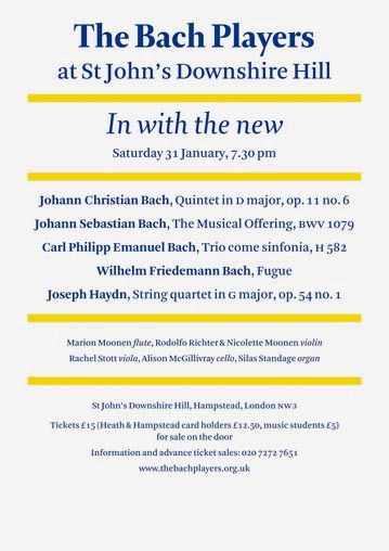 Marion Moonen flute, Rodolfo Richter & Nicolette Moonen violin, Rachel Stott viola, Alison McGillivray cello, Silas Standage harpsichord