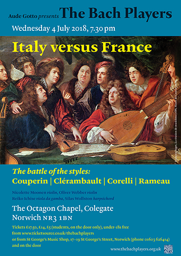 Italian or French? In the later seventeenth and early eighteenth centuries in Europe, two national musical styles were seen as opposing and in contest, though composers increasingly brought them together. This concert brings the styles to life in works by some of the brilliant composers of the times: Corelli, Couperin, Clérambault, Rameau