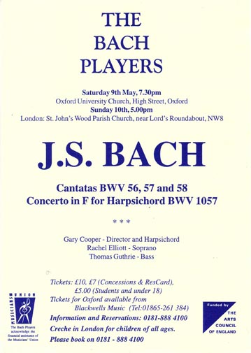 Rachel Elliott soprano, Thomas Guthrie bass, Catherine Latham, James Eastaway & Taka Kitazato oboe, Nicolette Moonen & Rodolfo Richter violin, Jane Rogers viola, Alison McGillivray cello, Cecelia Bruggemeyer double bass, Gary Cooper harpsichord