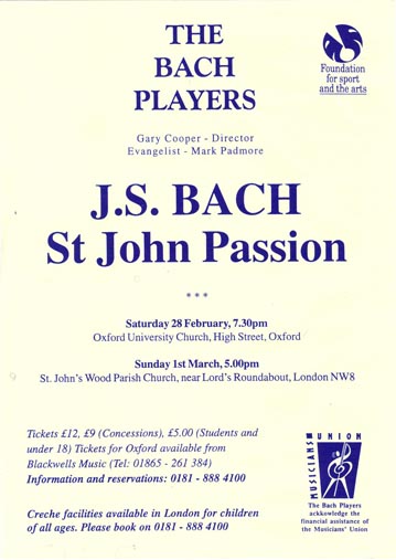 Mark Padmore Evangelist, Rachel Elliott & Carys Lane soprano, Sally Bruce-Payne & Charles Humphries alto, Andrew Carwood & Nicholas Hurndall Smith tenor, Thomas Guthrie & Robert MacDonald bass, Marion Moonen flute, Catherine Latham & James Eastaway oboe, Sally Jackson bassoon, Nicolette Moonen, Oliver Webber & Ellen O’Dell violin, Jane Rogers viola, Alison McGillivray cello, Elizabeth Bradley double bass, Jan Waterfield organ, Gary Cooper harpsichord