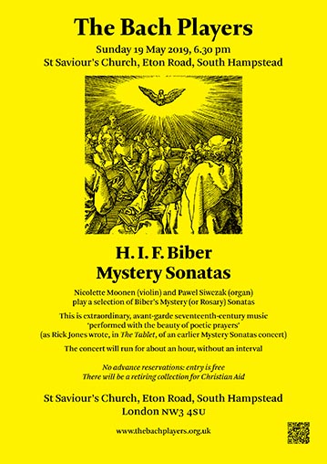 Nicolette Moonen and Pawel Siwczak play a selection of Biber’s Mystery (or Rosary) Sonatas. Pawel Siwczak will also play organ music by composers of Biber’s time.