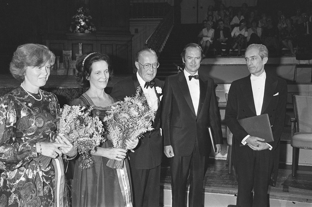 At the 1980 Erasmus Prize ceremony in Amsterdam, 8 September 1980: Alice Harnoncourt, Marie Leonhardt-Amsler, Prince Bernhard (awarding the prize), Nikolaus Harnoncourt, Gustav Leonhardt. The joint prize winners were Harnoncourt and Leonhardt.